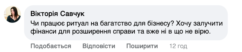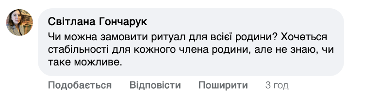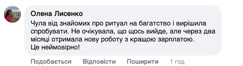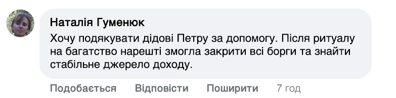 — Мої обряди – це поєднання молитви та особливих слів, які мають на меті направити енергію на добробут. Я проводжу іменні молитви, які читаю індивідуально для кожної людини. Щоб усе спрацювало, потрібна певна підготовка. Людина повинна опівночі запалити свічку і промовити: 'Хай все станеться як має статися, та буде – як буде. Ці слова пробуджують енергію достатку та удачі. Після цього людина відчуває, як в її житті починають відбуватися зміни – гроші знаходять шлях до її дому.